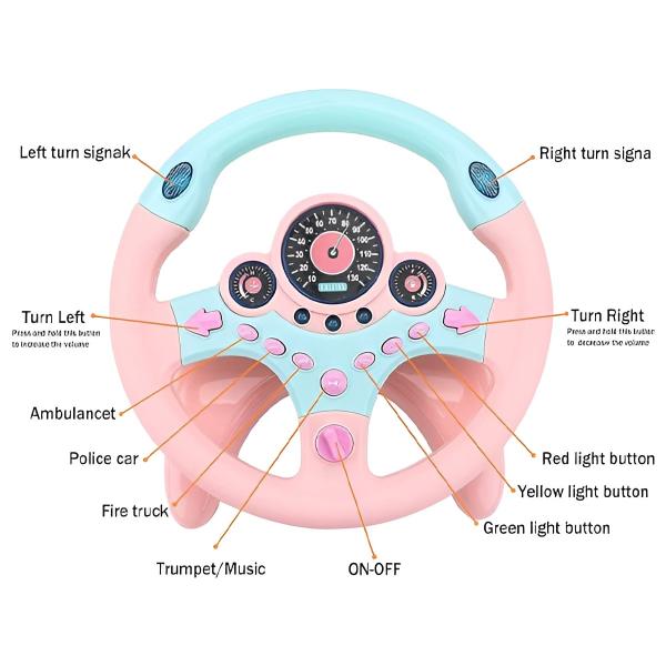 Mit lustigen Geräuschen, blinkenden Lichtern und leicht zu drückenden Tasten fesselt dieses Lenkrad junge Fahrer und regt sie zum fantasievollen Spielen an.