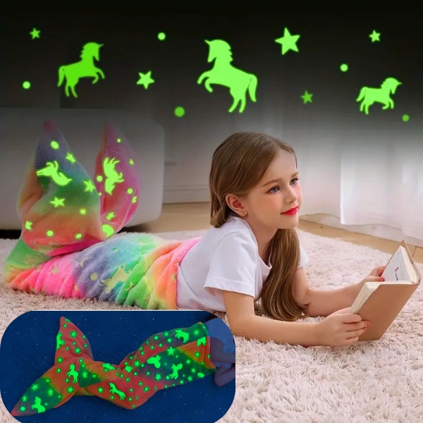 Die MERMAIDREAM-decke leuchtet im dunkeln und spendet ein beruhigendes licht, um nächtliche ängste zu lindern. Setzen sie sie einfach 20 minuten lang dem tageslicht aus, und sie leuchtet die ganze nacht. Wählen sie zwischen dem haifischschwanz- oder dem meerjungfrauenschwanz-design für zusätzliche magie, wenn ihr kind schläft.