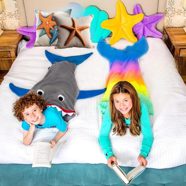 Wählen sie zwischen der haifischschwanz- oder der meerjungfrauenschwanz-decke. Diese decke ist ideal für lebhafte kinder, die gerne spielen und sich verstellen. Sie befriedigt ihre wilde seite und hält sie gleichzeitig warm.